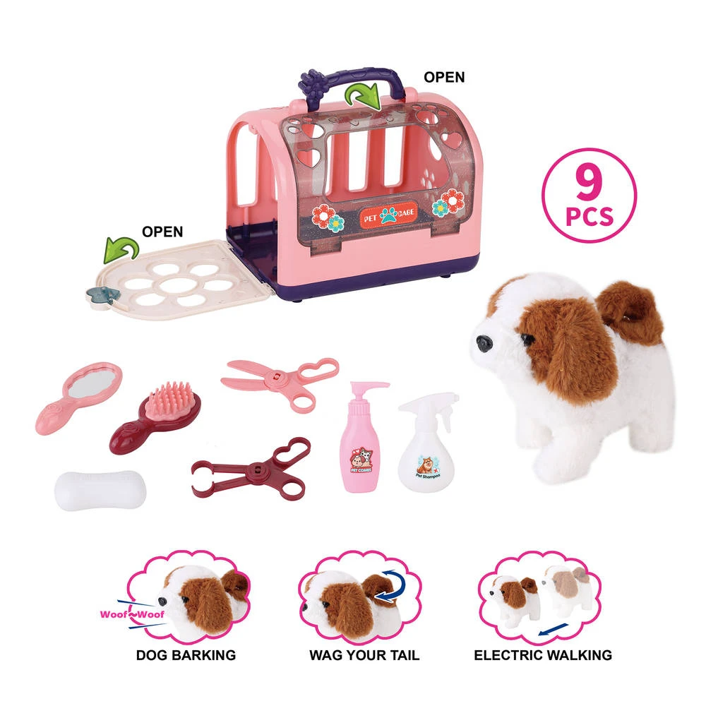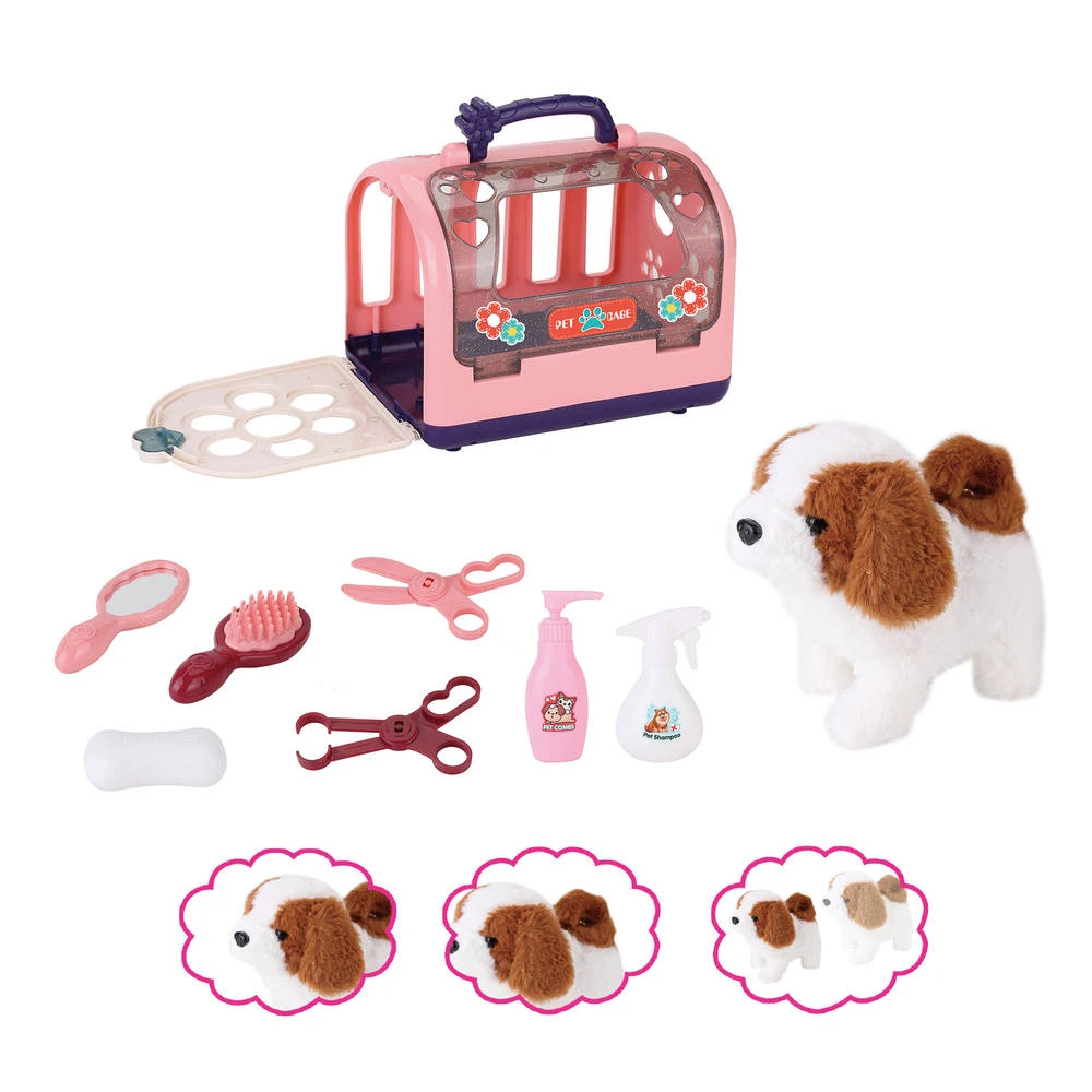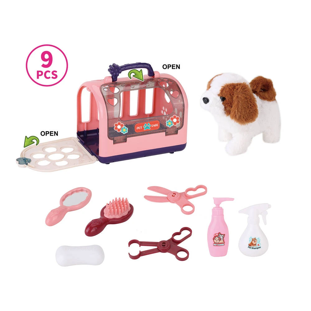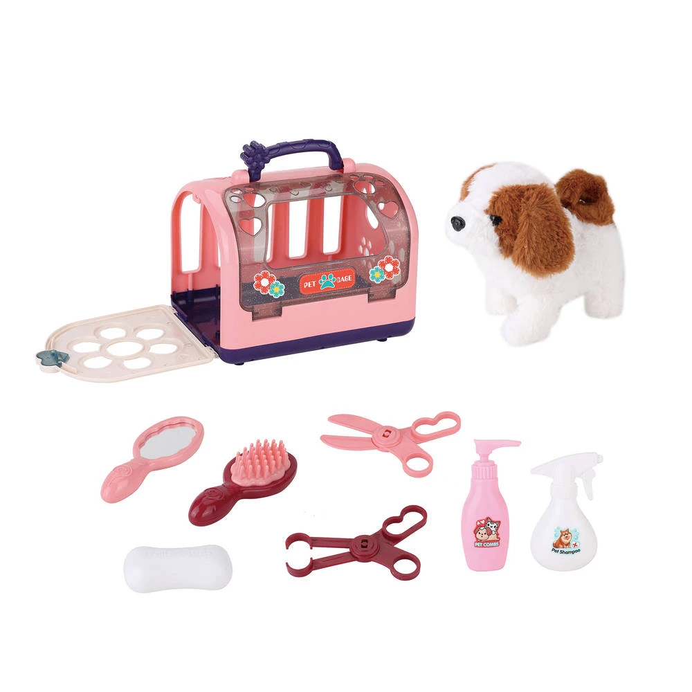 Heb je een puppy in huis en train je hem? Dan is het handig om hem ook eens te wassen. Daar helpt deze mooie huisdier badset met geluid je bij. Met deze 9-delige set kan je deze speelgoedhond goed wassen. In de set zit een hondje dat tevreden blaft en daarna wegloopt. Het hondje kan zelfs kwispelen met z’n staart. Nadat je je hond hebt gewassen kun je hem terugzetten in zijn kooi.