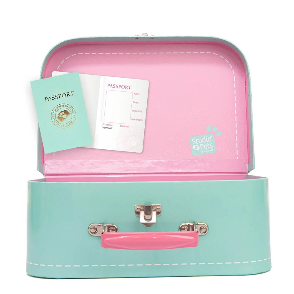 Deze prachtige turquoise koffer is uitermate geschikt voor een Studio Pets knuffel van 23 cm. Op die manier kan je je favoriete knuffel gemakkelijk overal mee naar toe nemen. De koffer wordt geleverd met een blanco paspoort speciaal voor jouw knuffel. Het koffertje is gemaakt van hoge kwaliteit karton.