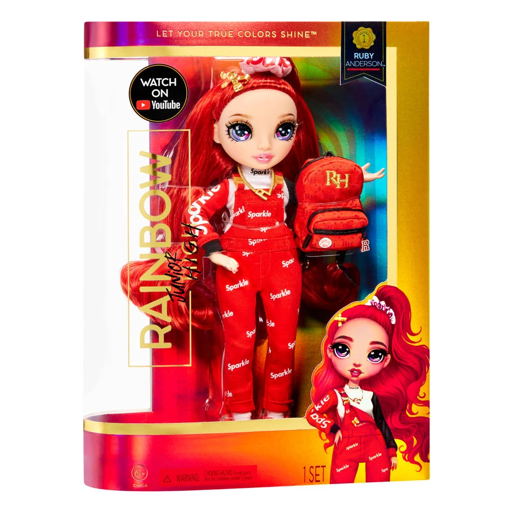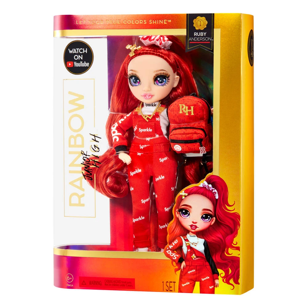 Met deze speelset kunnen kinderen eindeloos veel plezier beleven en fantasievolle verhalen verzinnen. Ze hebben schitterende kenmerken! Ruby Anderson is van top tot teen gekleed in het rood, haar lievelingskleur. Ze heeft een supermooi, jonger gezichtje, mode met prachtige details, prachtig lang, rood, krullend haar, lange wimpers en glazen ogen. Verzamel een regenboog aan adembenemend mooie Jr. High-modepoppen. Ze zijn inclusief hun eigen Jr. High-mode. Ruby komt uit een klein stadje, maar heeft grootse dromen! Zelfs op Junior High had ze al een eigen, unieke stijl waarmee ze zich onderscheidde van de rest. Ze draagt een Sparkle-top met lange mouwen, een schattige, rode Sparkle-tuinbroek met gouden gespen, geruite, hoge Sparkle-gympen en ze heeft haar rugzak voor school bij zich als accessoire. Ruby is al van jongs af aan creatief. Ze vindt het geweldig om oude favorieten op steeds weer nieuwe manieren te stylen. Het is geen verrassing dat haar rugzak ook een vurig type is. De rode rugzak van zachte stof kan open en dicht en is versierd met een speciaal ontworpen patch en gouden RH-borduursels. Het is het perfecte accessoire om haar satijnen Sparkle-scrunchie, twee gouden haarclips en halsketting met R in op te bergen.