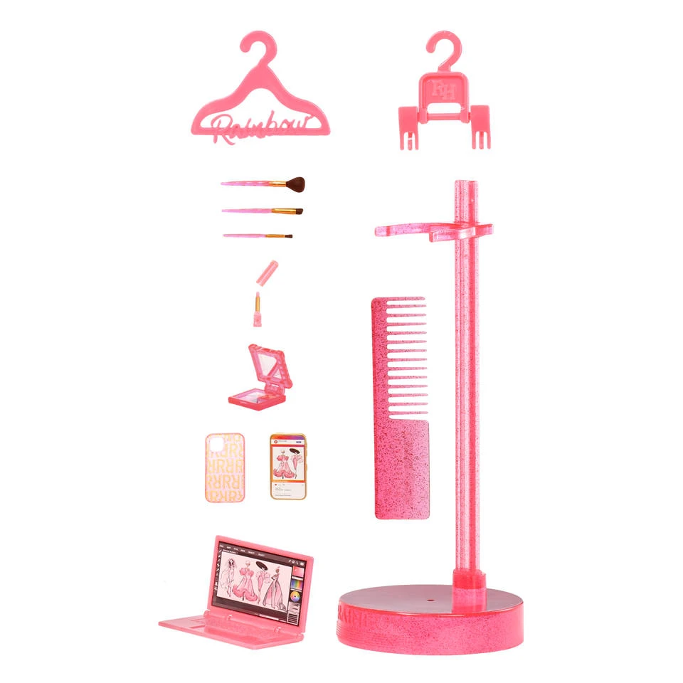 - De set bestaat uit een modepop, complete poppenoutfit, een paar poppenschoenen, poppenaccessoires: naaimachine, make-uppalet, haardroger, mobiel plus hoesje en poppenstandaard.